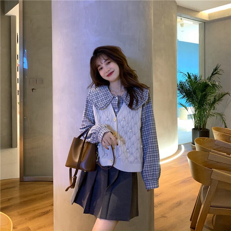 色:格子縞のシャツワンピース,ニットベストシングルピース