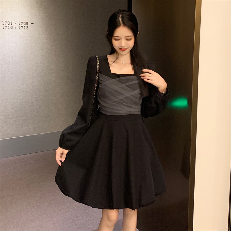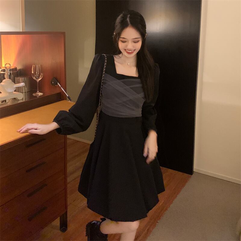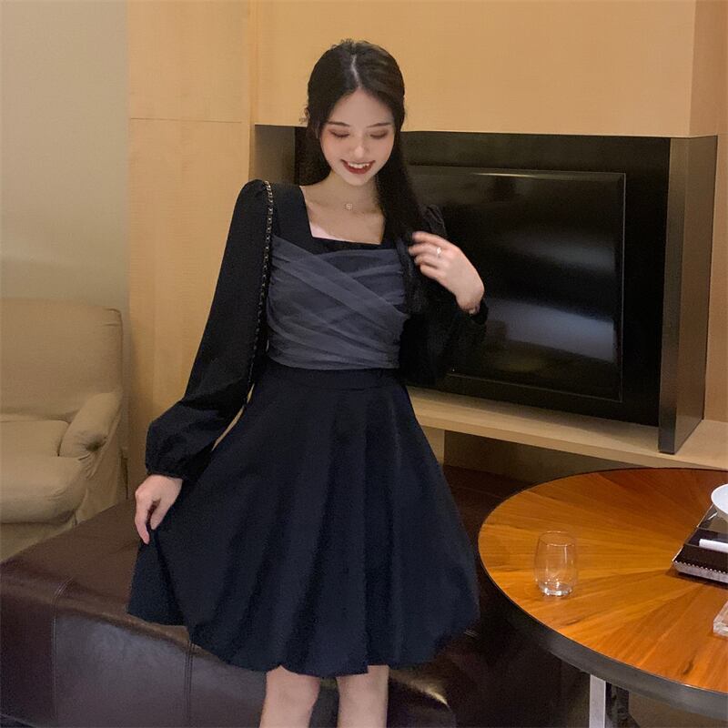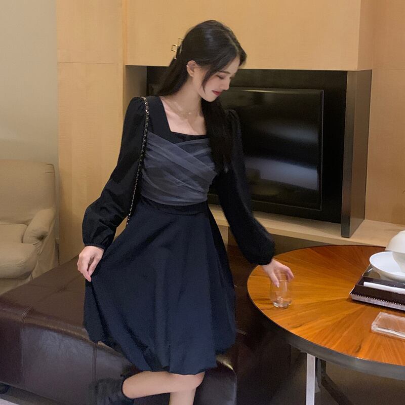 長袖スリーブドレス スプリングオータムウェストスカート ロング 春物 秋物 スクウェア 試着室64358390978
