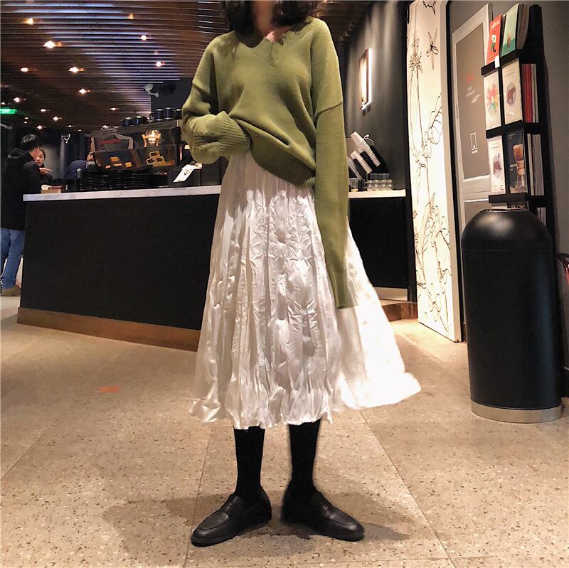 ホワイトプリーツスカート スプリングオータムハイウェストAライン薄手ロング 春物 秋物 試着室75584583892