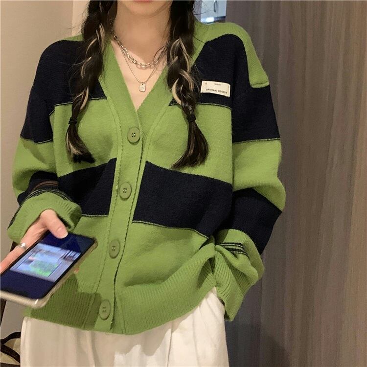 ストライプセーター コート スプリングオータムスタンダードルーズVネックニットカーディガン レトロ 春物 秋物 試着室61486098481