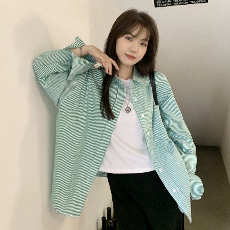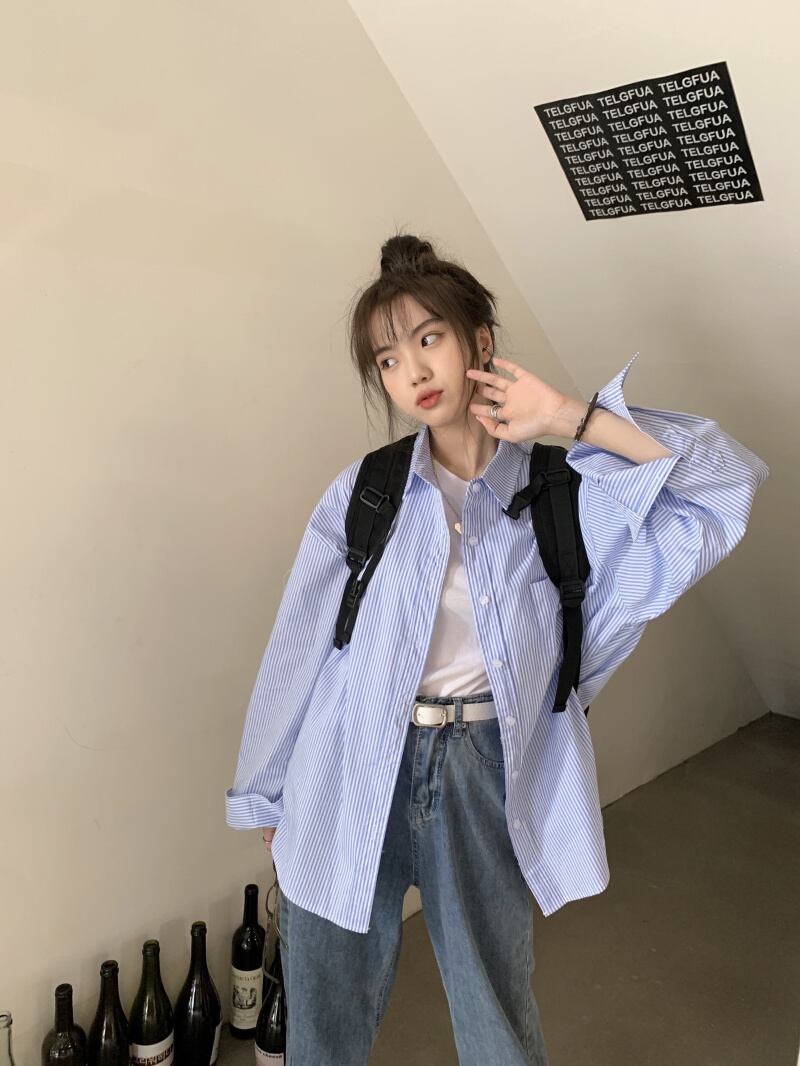 ブルーストライプシャツ スプリングオータムスタンダードスタイルブラウス ロング レトロ 春物 秋物 試着室29914928306