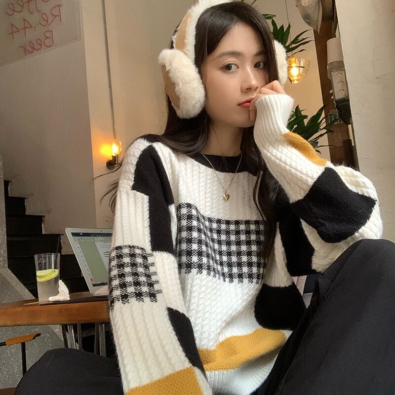 スタンダード格子柄セーター オータムウィンタースタイルルーズニットトップス レトロ 秋物 冬物 試着室84465391250