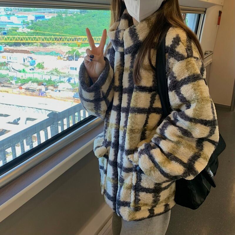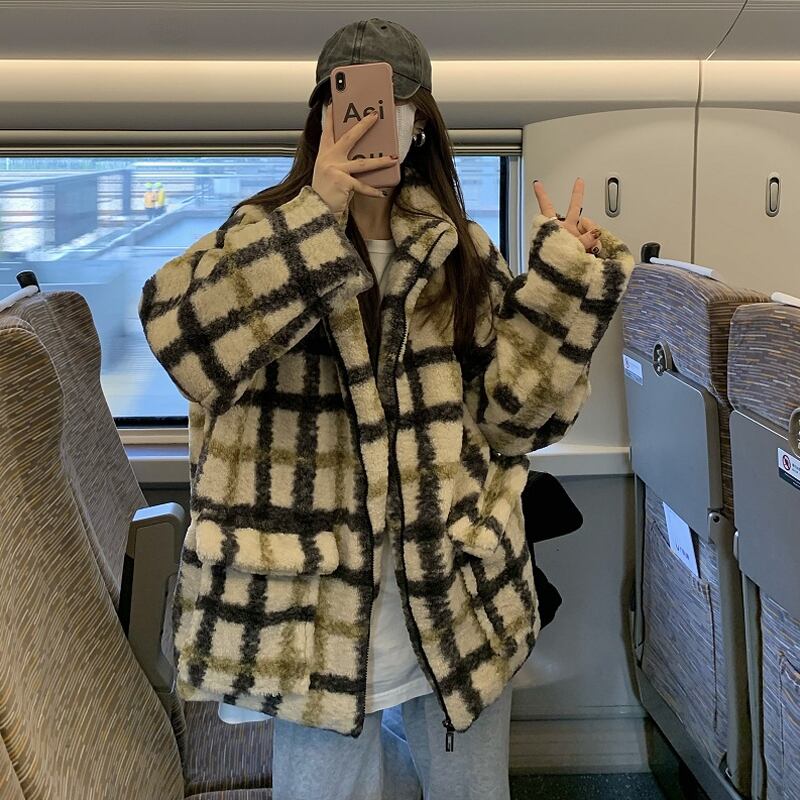 ウール格子柄ジャケット オータムウィンタースタンダードスタイルトップス コットン レトロ ストリート 秋物 冬物 試着室96515687306
